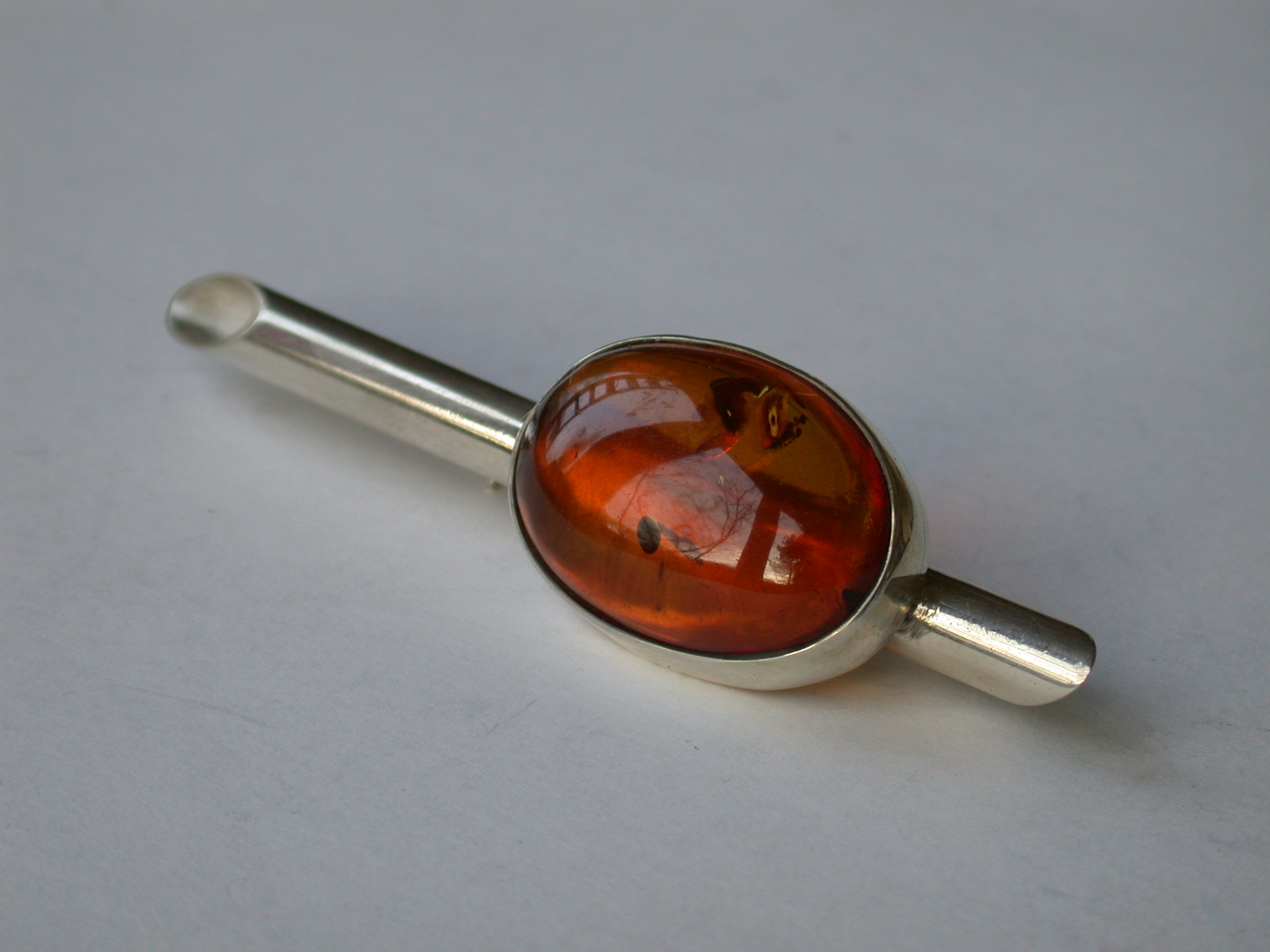 Broche met donkere maar heldere barnsteen cabochon. Eerste gehalte zilver