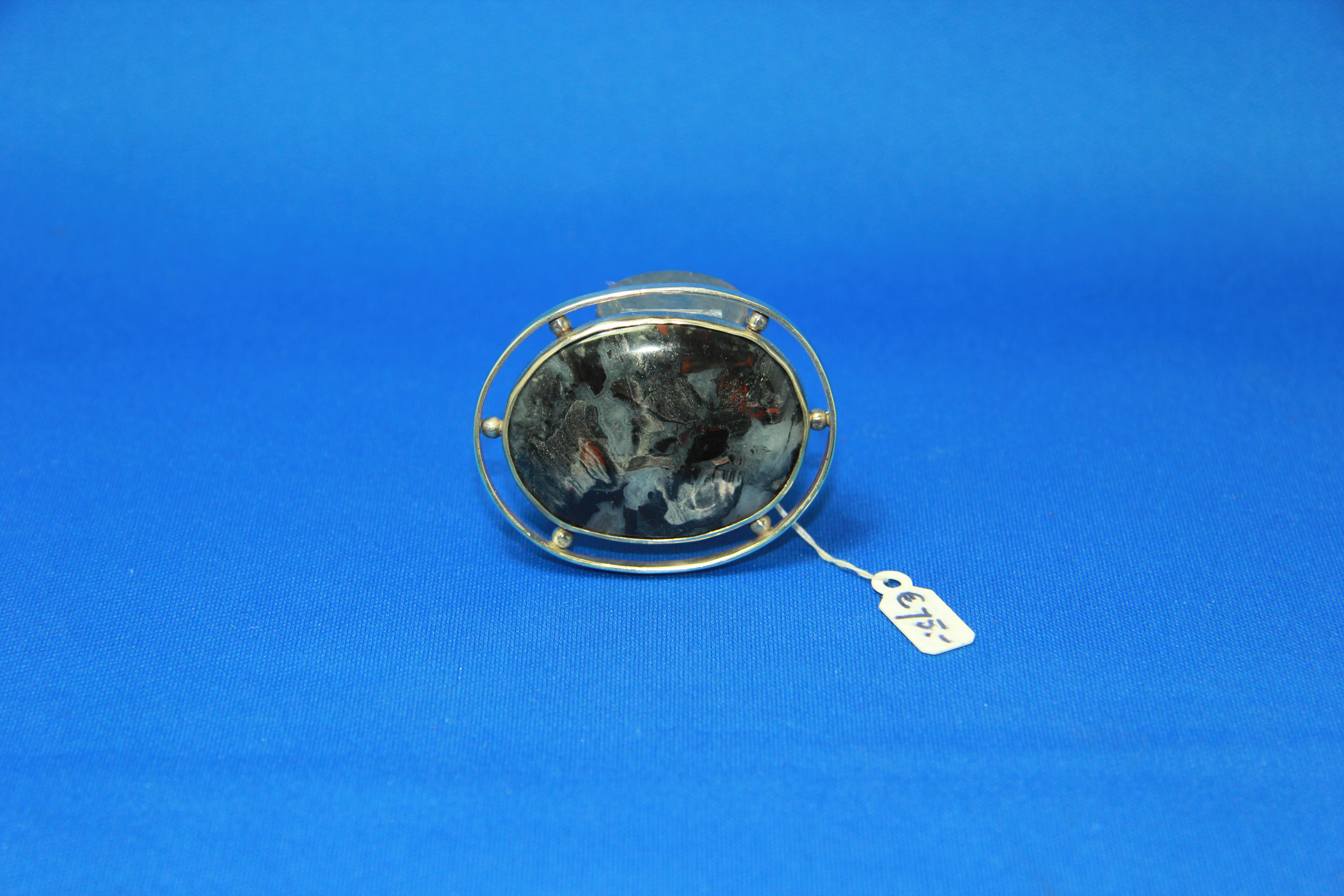 Deze broche is van eerste gehalte zilver en heeft een mos agaat cabochon geslepen steen